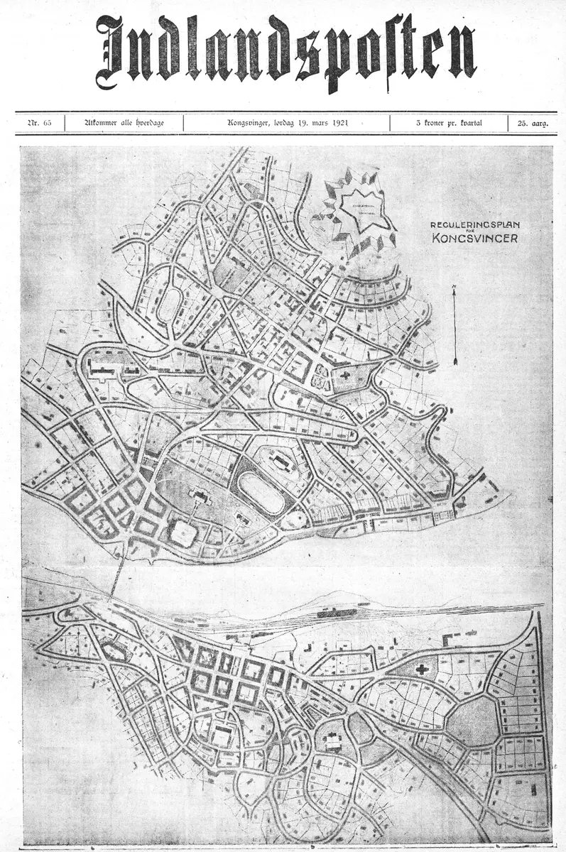 19. mars 1921 trykket avisene den nye byplanen på forsidene. Byarkitekt Pedersen var opptatt av hagebyfilosofien og tegnet klynger med villastrøk. Folk skulle bo luftig og fritt. Og vegene fikk slynge seg freidig oppover solbakkebyen ved Glomma. Nasjonalbiblioteket