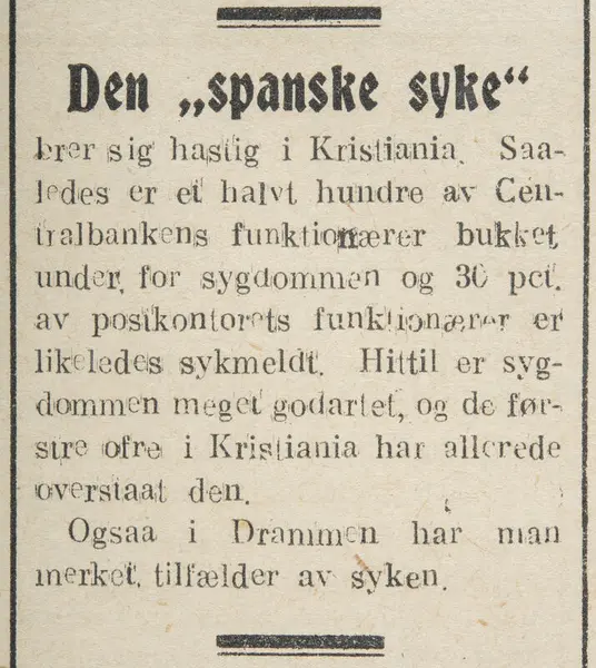 I pandemiens første fase hadde sjukdommen et ganske mildt preg, og de fleste overlevde. Likevel påvirket den dagliglivet i Kristiania i stor grad. Fra Indlandsposten, 4. juli 1918.