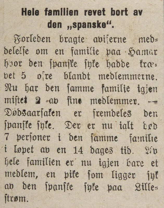 Avisene bærer vitnesbyrd om hvor voldsomt spanskesjuken rammet lokalsamfunn og familier. Her er artikler fra Indlandsposten og Hedemarkens Amtstidende i oktober 1918. - 2/4