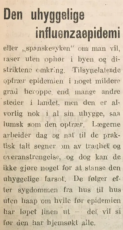 Avisene var fulle av stoff om spanskesjuken høsten 1918. Dette var den viktigste kilden til informasjon for folk, og omtalene vitner om stor utrygghet og frykt for pandemien. Nedenfor vises noen få eksempler hentet fra Indlandsposten og Hedemarkens Amtstidende.