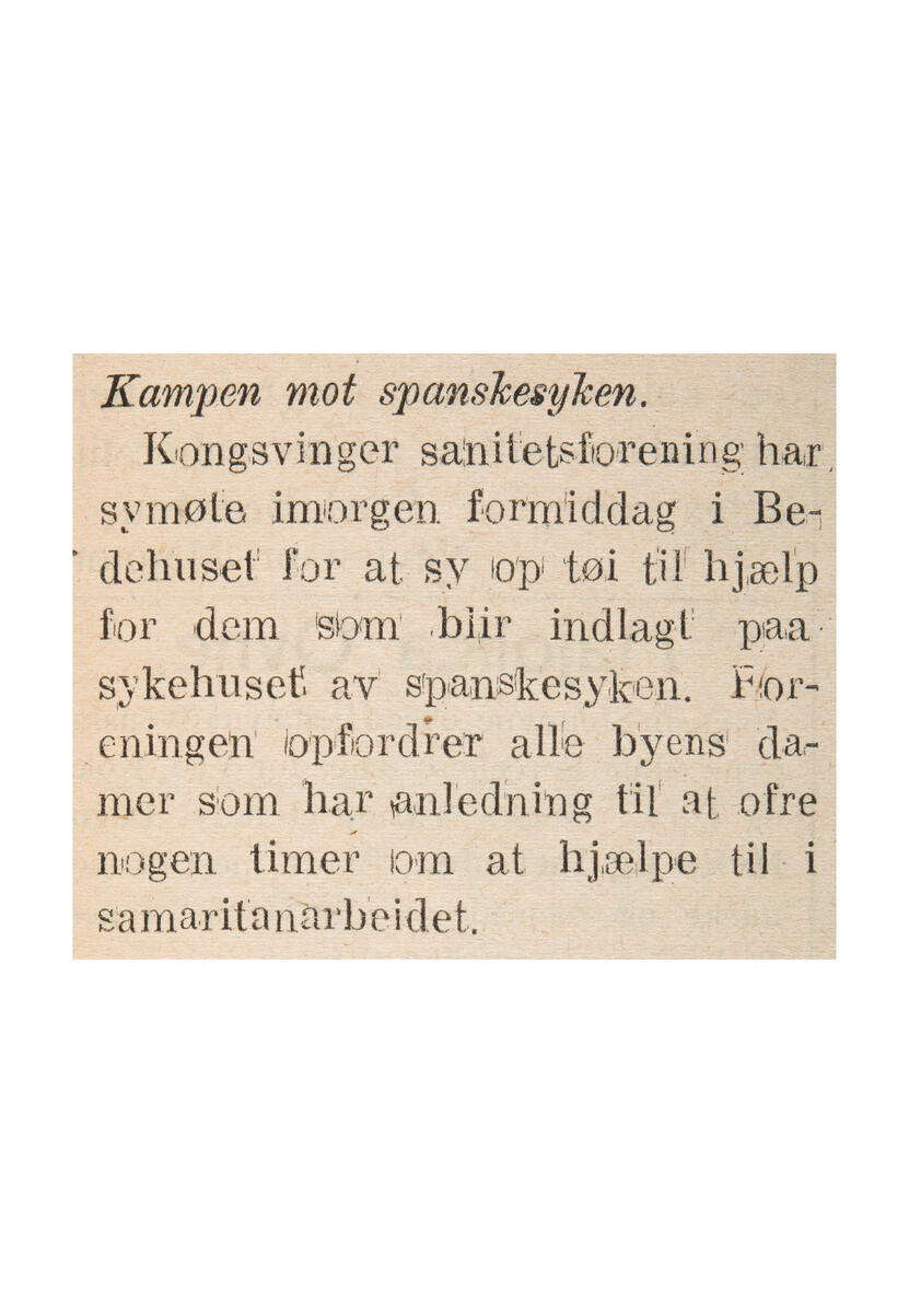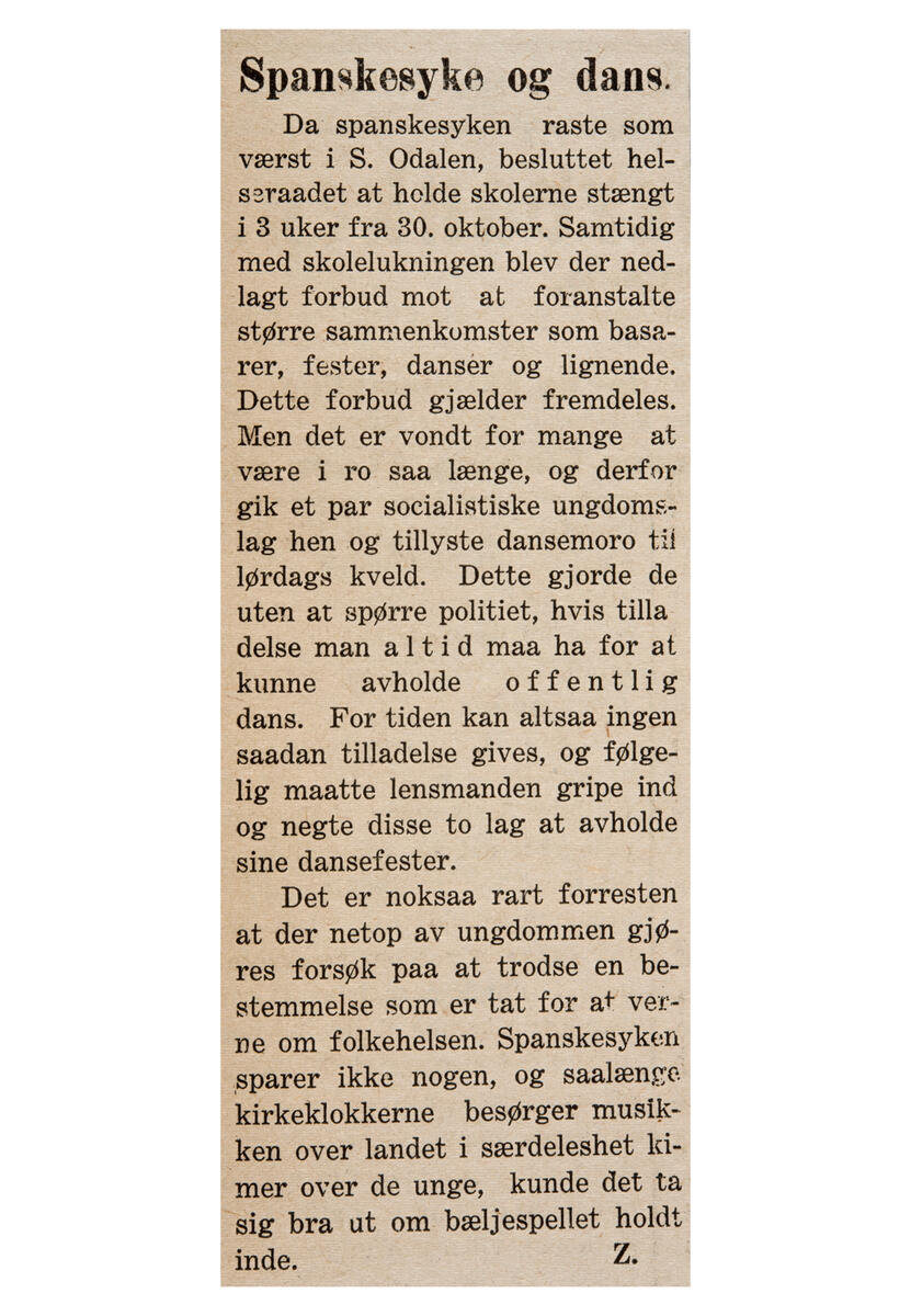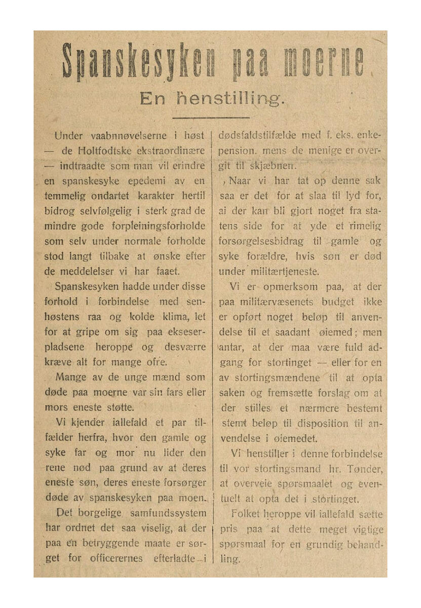 Faksimilene er hentet fra glomdalen.no mars 2020 og nrk.no i januar 2021, samt Indlandsposten høsten 1918 og Folkeviljen januar 1919.