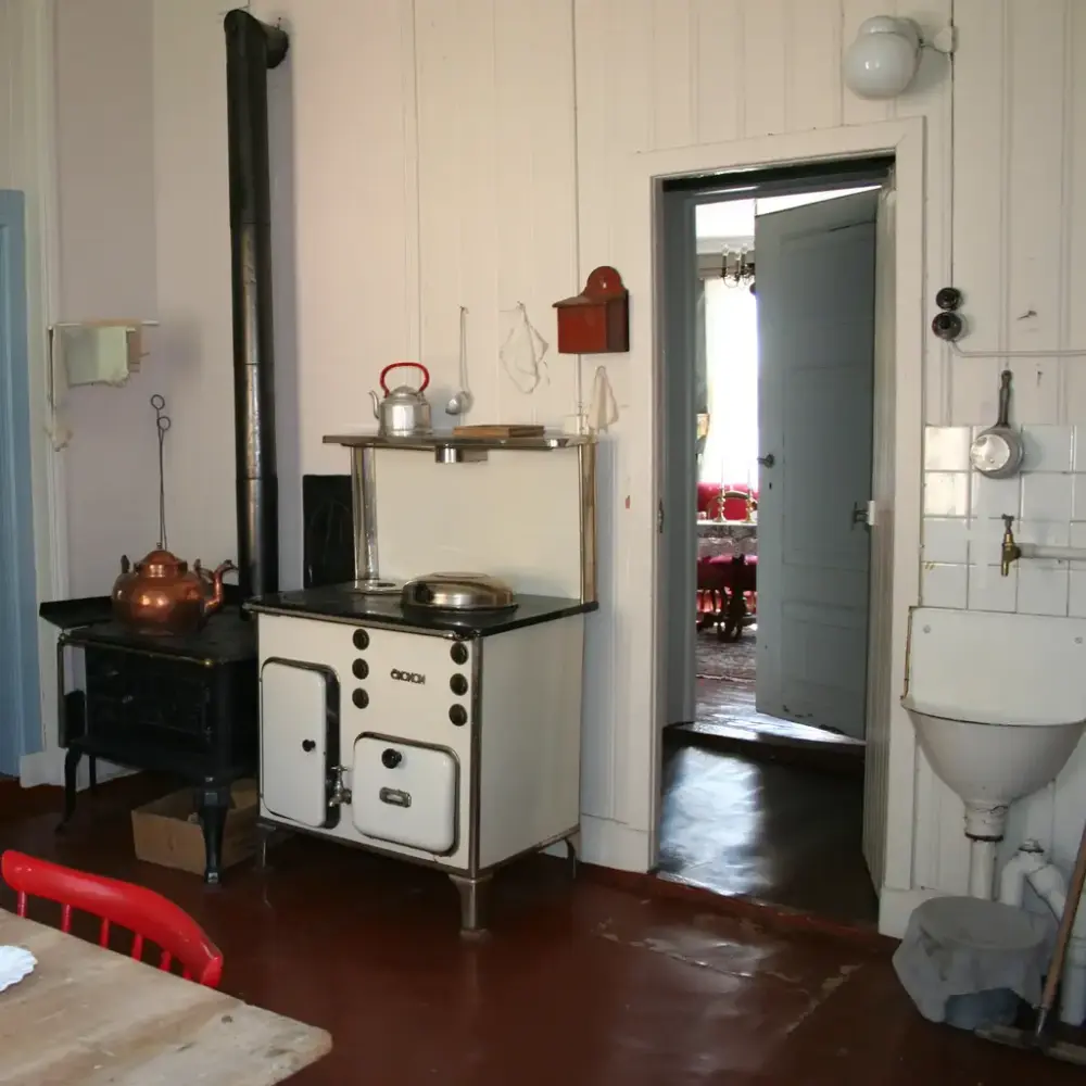 På motsatt side av dagligstuen ligger hjørneværelset, som ble brukt som gjesterom. Her står det to senger i jugendstil, én av tre og én i metall. Ved døren er det montert en bit av ny tapet, som ble funnet under opprydning på loftet. Ved vinduet mot festningsbakken er Ninas sy-krok. I spisestuen står et møblement fra 1880-årene. Kjøkkenet har moderne varmtvannsbereder på veggen og elektrisk komfyr fra førkrigsårene ved siden av den gamle vedkomfyren. Den smale og bratte trappen fra spisestuen og opp til Nina og Haralds soverom på kvisten ble bygd da Nina og Harald flyttet inn. Her står en kommode med vaskevannsfat og en kiste med tøy. Etasjeovnen fra 1808 er nesten like gammel som huset selv.